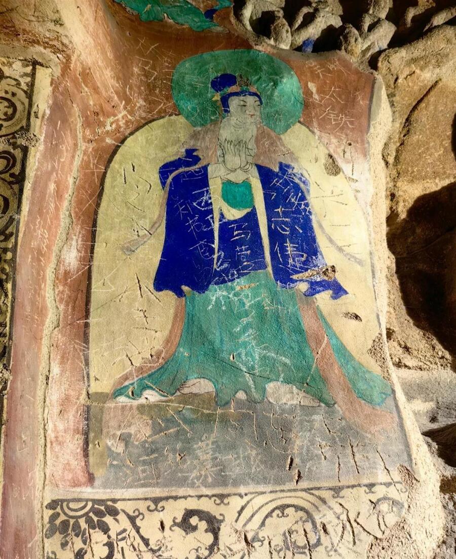 云冈石窟内佛像和彩绘上被人刻字(发帖截图)
