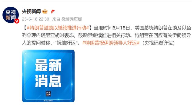 事情详述 当地时间6月18日,美国总统特朗普在谈及以色列总理内塔尼亚胡时表态,鼓励其继续推进相关行动。特朗普在回应有关伊朗领导人的提问时称,“祝他好运”。(央视记者许弢) 来源:央视新闻 特朗普鼓励以, 继续推进, 特朗普