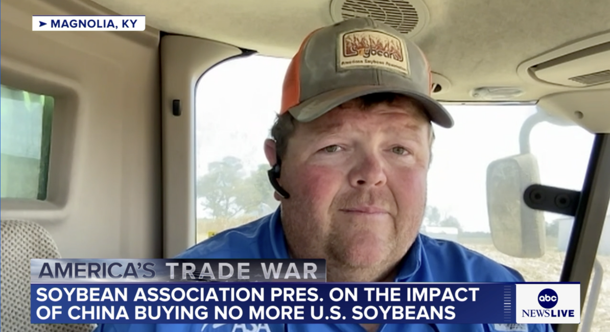 【环球网报道】美国广播公司(ABC)当地时间19日播出一段对美国大豆协会主席凯莱布·拉格兰的现场直播采访。画面中,拉格兰坐在拖拉机上,再次提到目前美国大豆正值收获季,中国的订购量却为“零”。他向美国总统特朗普发出紧急呼吁:我们需要的是强大的市场和机遇,中国市场对我们的生计至关重要。