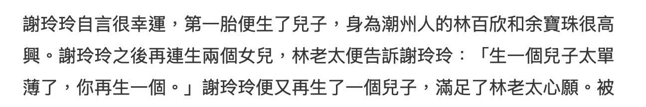 谢玲玲能够在林家立足,或者说能够完全讨得公公婆婆欢心的主要原因还是为林家开枝散叶。谢玲玲的公公婆婆都是潮州人,传统的潮州人很注重子孙繁衍,而且对男孙格外喜欢。谢玲玲其实还是幸运的,第一胎就生了一个儿子,这让林老太满心欢喜,了却了老太太的心愿。不过只有一个儿子是不够的,在连生了两个女儿后,林老太又敦促谢玲玲应该再生一个儿子,谢玲玲又照做,又生了一个儿子一个女儿,一共拥有五个子女。如此一来她在林家的地位就稳固得无可动摇,还得到了公公婆婆在背后撑腰。