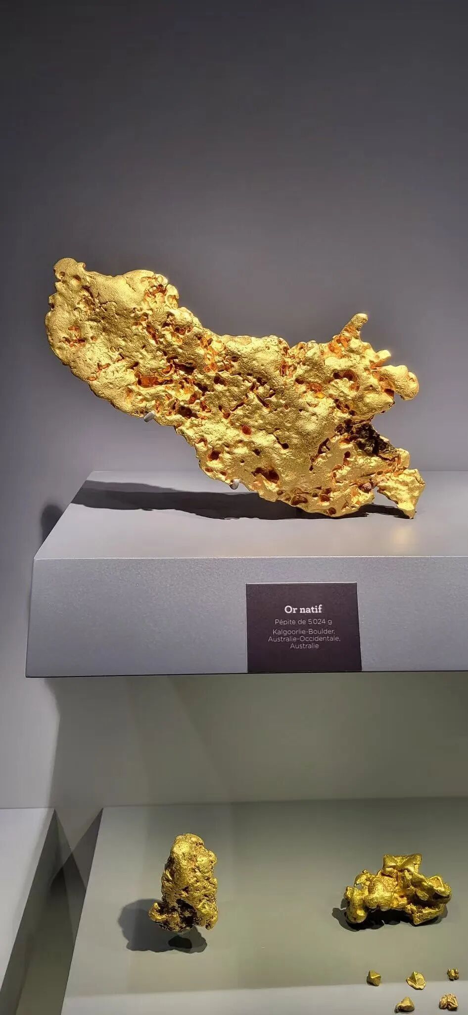 这些黄金不仅本身就是贵金属,还具有重要的历史和科研价值,包括加利福尼亚淘金热时期的标本、18世纪由玻利维亚捐赠给法国科学学院的金块、1833年由俄国沙皇尼古拉一世赠予博物馆的乌拉尔金块,以及一块1990年在澳洲发现的重量超过5公斤的金块。