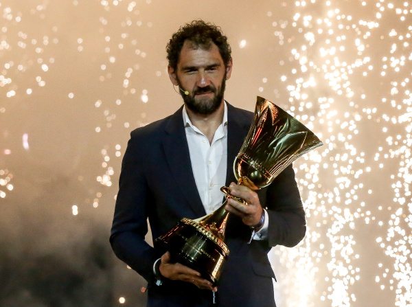 4月29日,前西班牙篮球运动员加瓦霍萨在抽签仪式上展示世界杯冠军奖杯。 新华社发(乌马利摄)