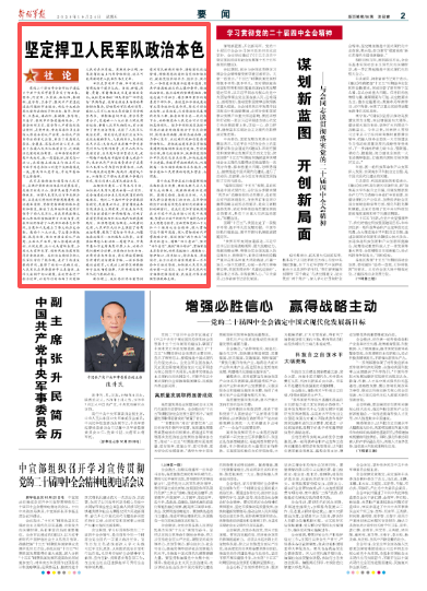 如期实现建军一百年奋斗目标,加快把人民军队建成世界一流军队,是全面建设社会主义现代化国家的战略要求。党的二十届四中全会着眼强国建设、民族复兴伟业,紧紧围绕基本实现社会主义现代化,对未来五年发展作出顶层设计和战略擘画,明确了高质量推进国防和军队现代化的蓝图规划。历经思想政治锻造、正风肃纪反腐,人民军队从根本上强固了特有政治优势,凝聚了团结奋斗伟力,积聚起奋进强军一流的强大正能量。全军要把思想和行动统一到党中央、中央军委和习主席决策部署上来,始终以党的旗帜为旗帜、以党的方向为方向、以党的意志为意志,毫不动摇贯彻落实新时代政治建军方略,一刻不停推进政治建军,以政治上的坚定确保枪杆子永远听党指挥,不断开创国防和军队现代化新局面。