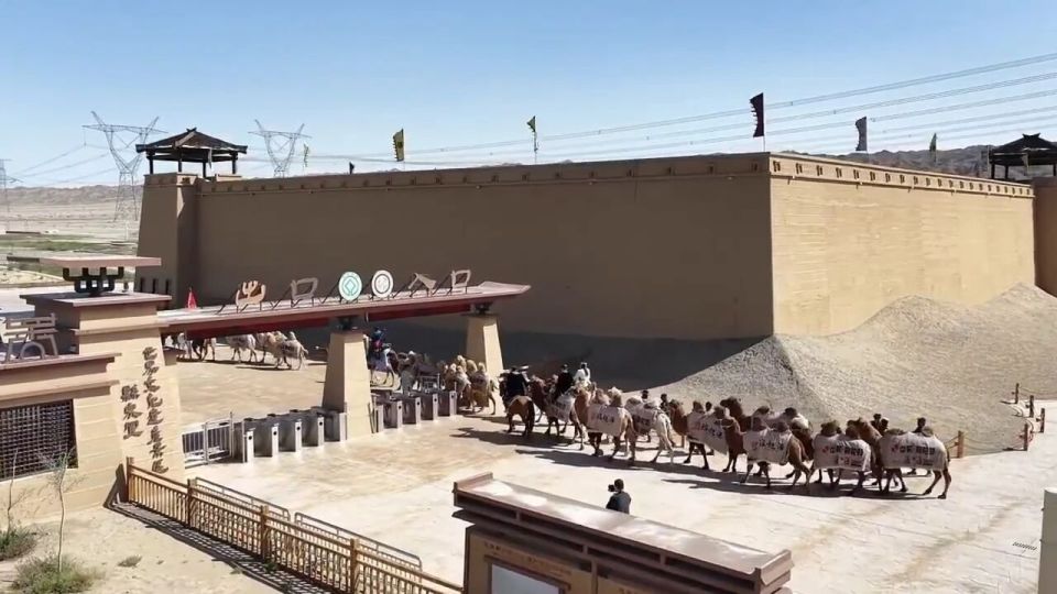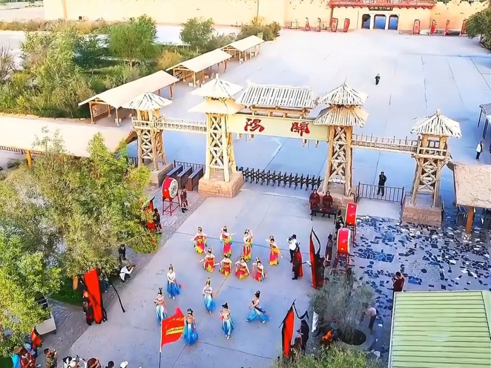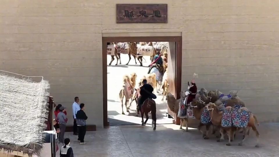 9月12日,驼队在阳关景区复刻了震撼的入关仪式:身着古装的 “官吏” 发放通关文牒,飞天舞衣袂翻飞间,驼铃声与乐声共振。