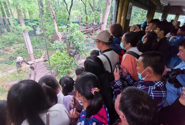 上海动物园大熊猫馆,室内的“星光”、室外的“和风”吸引了大批市民游客驻足 陈玺撼 摄