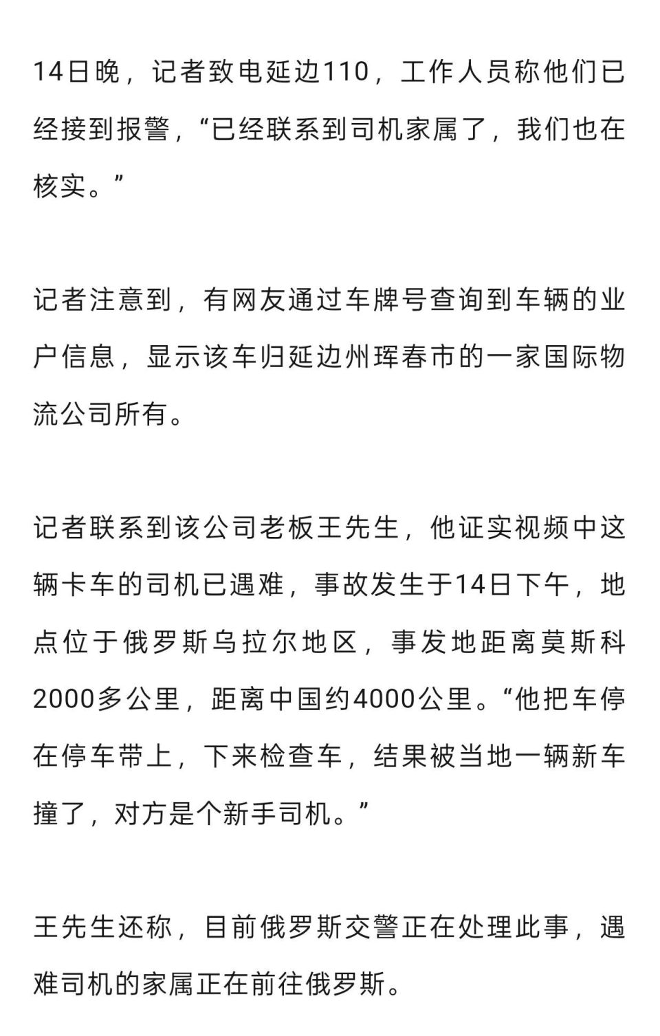 北京时间11月14日下午,一位在俄罗斯的华人发布了一段视频,称当天一位中国司机不幸遇难,找不到其所属公司,视频中有该辆卡车的车牌号。