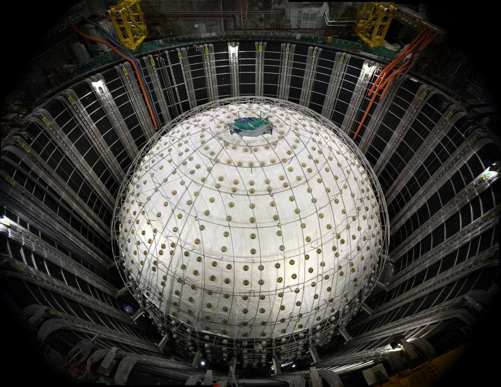 第一帧:2024年10月9日拍摄的建设中的江门中微子实验中心探测器(拼接照片)。其核心是装在巨型有机玻璃球内的2万吨液体闪烁体。这是目前全球最大的有机玻璃容器,它使液体闪烁体的体积比国际现有最大规模增大了20倍。