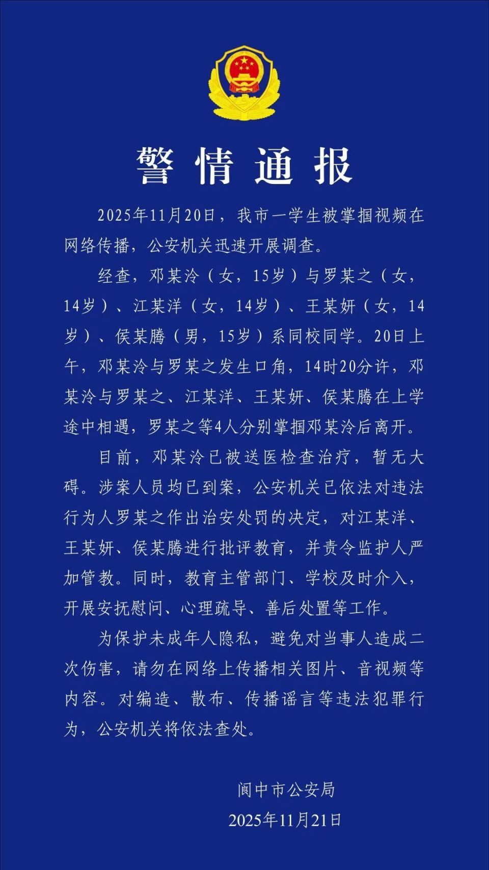 为保护未成年人隐私,避免对当事人造成二次伤害,请勿在网络上传播相关图片、音视频等内容。对编造、散布、传播谣言等违法犯罪行为,公安机关将依法查处。