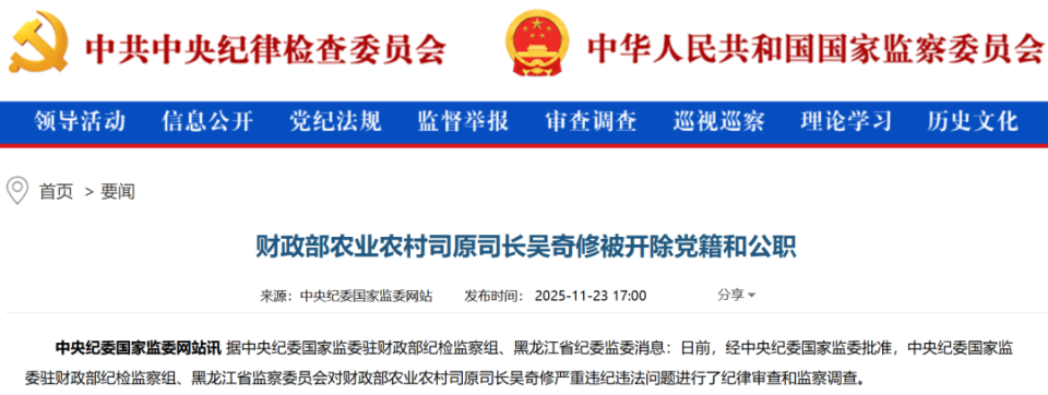 11月23日,中央纪委国家监委网站发布了一则消息:日前,经中央纪委国家监委批准,中央纪委国家监委驻财政部纪检监察组、黑龙江省监察委员会对财政部农业农村司原司长吴奇修严重违纪违法问题进行了纪律审查和监察调查。