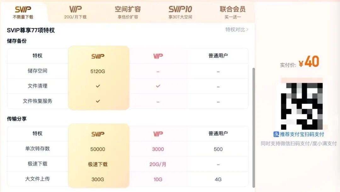 ▲ 每月支付40元开通百度网盘SVIP服务。