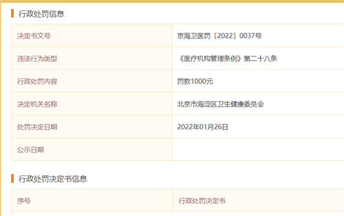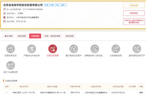 今年1月,北京金准医学检验实验室有限公司因任用非卫生技术人员从事医疗卫生技术工作,被北京市海淀区卫生健康委员会罚款。