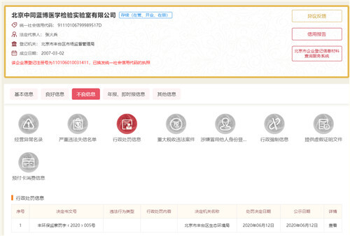 北京中同蓝博医学检验实验室也有“前科”。北京市丰台区生态环境局2020年6月在《丰环保监察罚字﹝2020﹞005号》处罚决定书中,对该机构进行行政处罚。