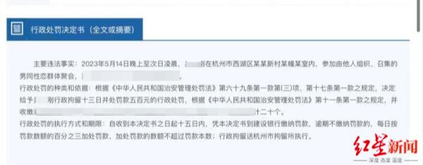 5月16日,杭州市有6人因参与聚众淫乱被处罚,该行政处罚决定书被公示于浙江政务服务网后,引发网络关注。在6人共6份行政处罚决定书中,均公示了被处罚人的完整姓名。其中一则行政处罚决定书中写道,被处罚人参加由他人组织、召集的男同性恋群体聚会,进行淫乱活动,还列出了违法细节以及现场收缴的相关物品清单。