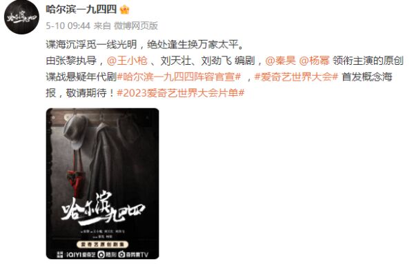 5月10日,电视剧《哈尔滨一九四四》官宣阵容并发布概念海报。该剧是由张黎执导,王小枪、刘天壮、刘劲飞编剧,秦昊、杨幂领衔主演的原创谍战悬疑年代剧。