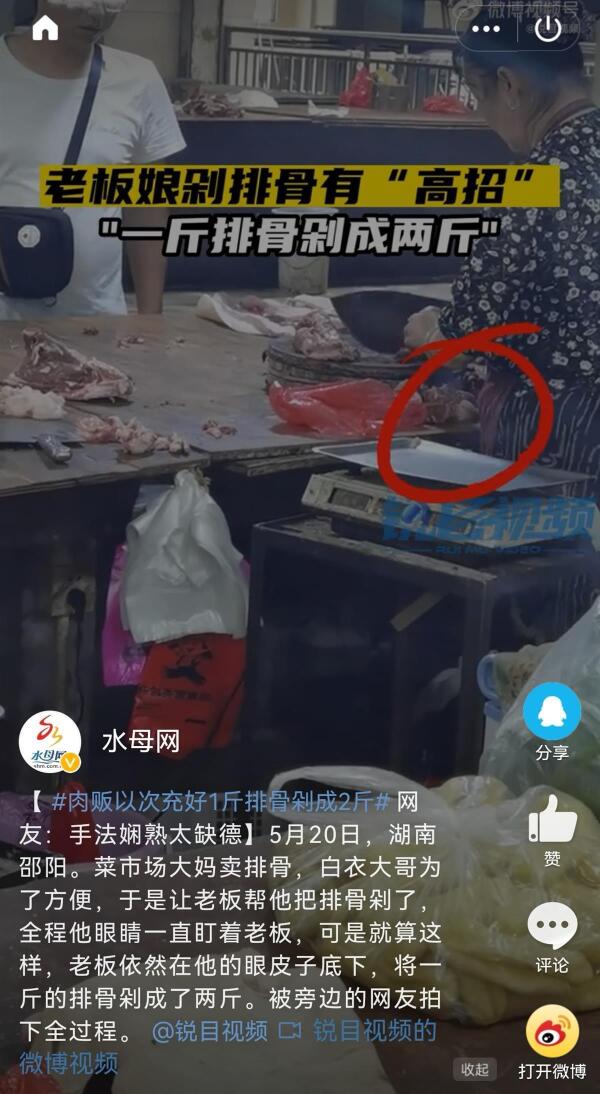 5月20日,湖南邵阳。菜市场大妈卖排骨,白衣大哥为了方便,于是让大妈帮他把排骨剁了,全程他眼睛一直盯着大妈,可是就算这样,大妈依然在他的眼皮子底下,将一斤的排骨剁成了两斤。