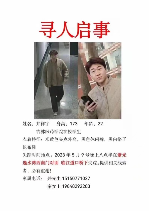 寻人启事显示,失联者井祥宇身高175厘米,22岁,是吉林医药学院在读学生,失联时身上穿着米黄色夹克外套,黑色休闲裤,黑白格子帆布鞋。