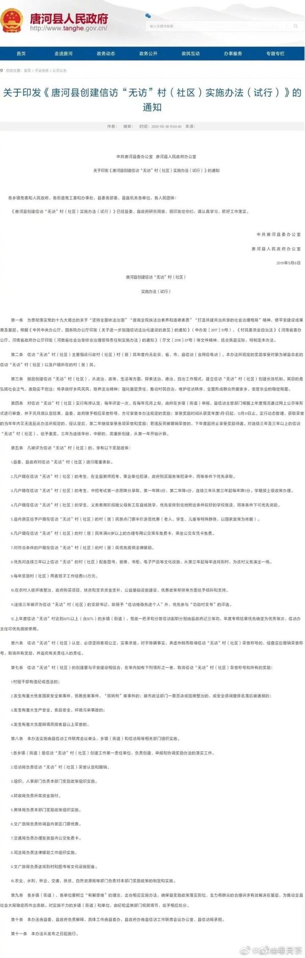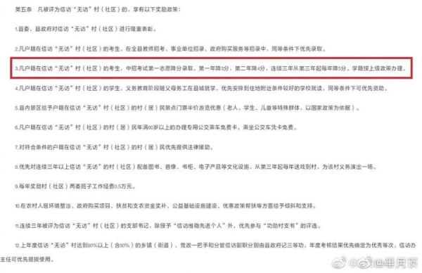 调查发现,早在2020年,河南省南阳市唐河县就出台过相关政策,据唐河县政府网站,唐河县2020年发布的《唐河县创建信访“无访”村(社区)实施办法(试行)》中称,凡户籍在“无访”村(社区)的考生中招考试第一志愿降分录取,第一年降3分,第二年降4分,连续三年从第三年起每年降5分。