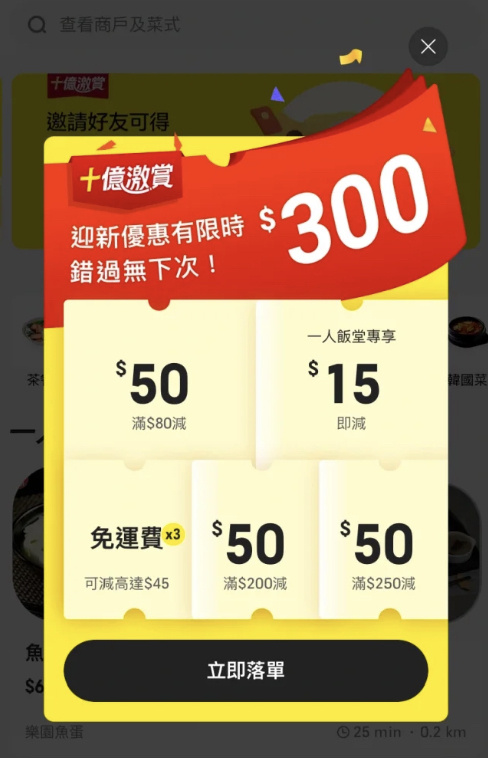 应用端显示,为了吸引香港地区的新用户,KeeTa推出了10亿港币激赏计划,每位新用户注册可以获得价值300港币的优惠券,用于满减和运费等。