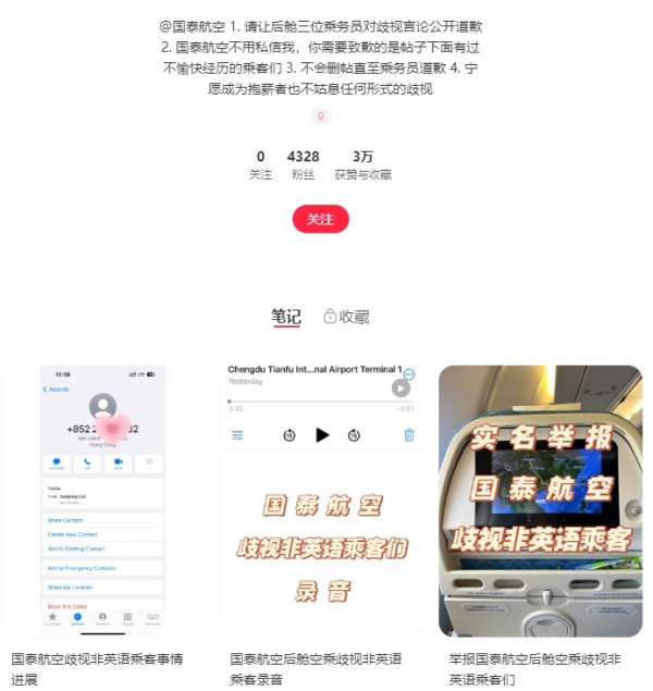 该乘客的帖文和录音引发了网友的广泛关注和愤怒,也有不少网友发帖讲述了自己乘坐国泰航空时遇到的歧视。