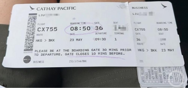23日上午,上游新闻记者联系上来自北京的刘先生时,他刚刚由中国香港起飞落地泰国曼谷,乘坐的是国泰航空CX775航班。