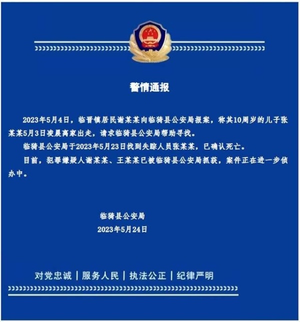 5月24日,山西临猗县公安局通报:5月4日,临晋镇居民谢某某向临猗县公安局报案,称其10周岁的儿子张某某5月3日凌晨离家出走,请求临猗县公安局帮助寻找。临猗县公安局于2023年5月23日找到失踪人员张某某,已确认死亡。目前,犯罪嫌疑人谢某某、王某某已被临猗县公安局抓获,案件正在进一步侦办中。