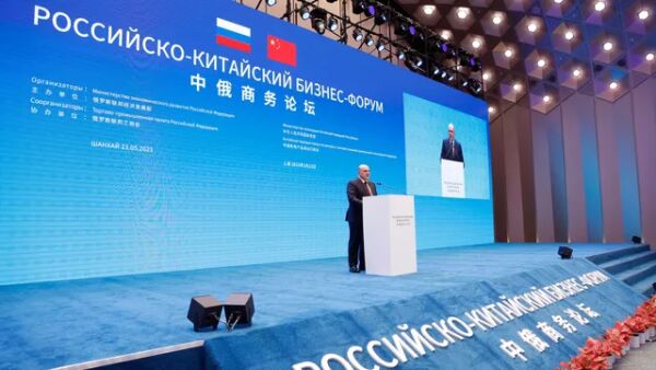 俄罗斯总理米舒斯京在上海举行的俄中商务论坛上发表演讲