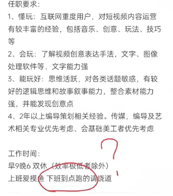 单从任职要求来看,均与岗位相关,并无明显不妥。但该公司却在工作时间一栏明确提到,“早九晚六、双休(效率极低者除外),上班爱摸鱼、下班到点跑的请绕道”,让许多人不得不思量该公司的工作强度问题。