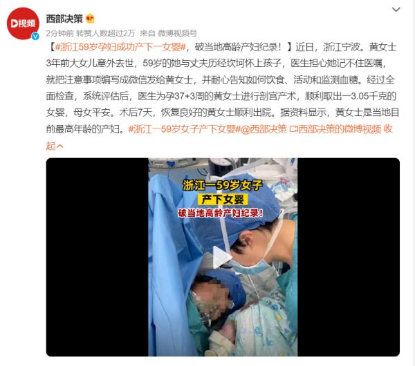 5月24日,据西部决策微博:近日,浙江宁波。黄女士3年前大女儿意外去世,59岁的她与丈夫历经坎坷怀上孩子,医生担心她记不住医嘱,就把注意事项编写成微信发给黄女士,并耐心告知如何饮食、活动和监测血糖。经过全面检查,系统评估后,医生为孕37+3周的黄女士进行剖宫产术,顺利取出一3.05千克的女婴,母女平安。术后7天,恢复良好的黄女士顺利出院。据资料显示,黄女士是当地目前最高年龄的产妇。