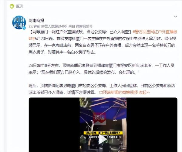 导读:5月23日晚,有网友爆料厦门一名主播在户外直播的过程中突然被人拿刀砍。当地派出所一工作人员24日表示:警方已经介入,具体的后续会发布,会处理的。