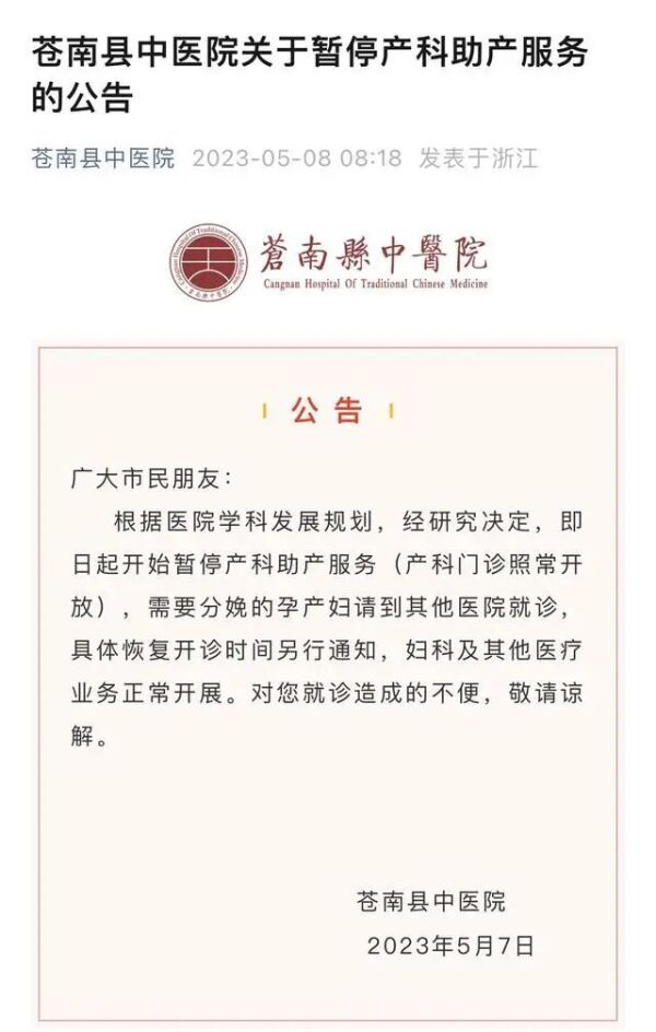 此外,2023年5月7日,浙江省苍南县中医院的一则公告引发关注。公告称,根据医院学科发展规划,经研究决定,即日起暂停产科助产服务(产科门诊照常开放)。