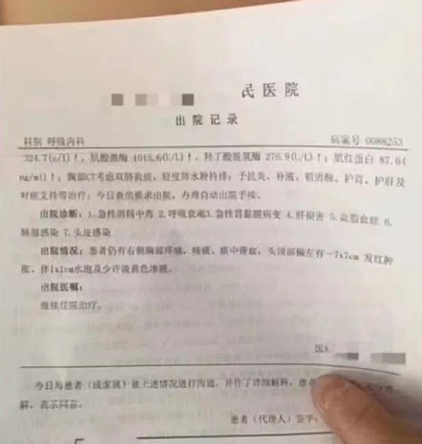 记者注意到,在三千哥2022年11月的一条视频中,放出了他的出院记录,上面的诊断写明:1.急性酒精中毒;2. 呼吸衰竭;3.急性胃黏膜病变;4.肝损害;5. 高血脂症;6.肺部感染;7.头皮感染。同样在这条视频里,他展示了自己昏迷后送进医院抢救的片段。