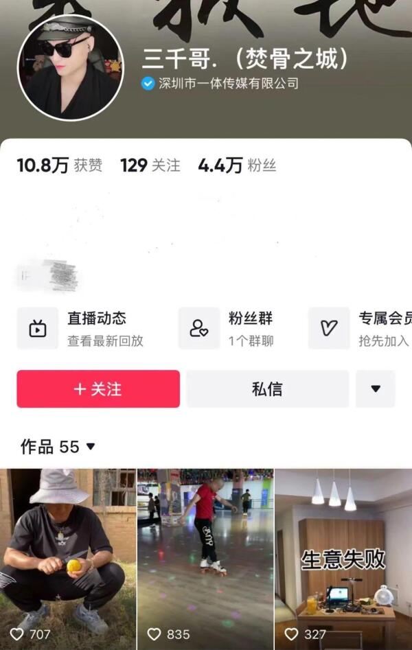 三千哥的账号首页。网络截图