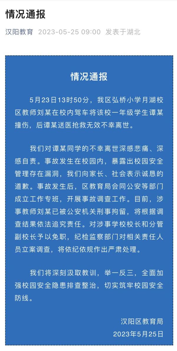 5月23日13时50分,我区弘桥小学月湖校区教师刘某在校内驾车将该校一年级学生谭某撞伤,后谭某送医抢救无效不幸离世。