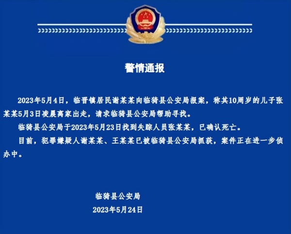 据山西运城临猗县公安局最新通报,此前警方悬赏1万元寻找的10岁男孩张某侨,在失联20天后确认不幸身亡。犯罪嫌疑人谢某某、王某某已被临猗县公安局抓获,案件正在进一步侦办中。