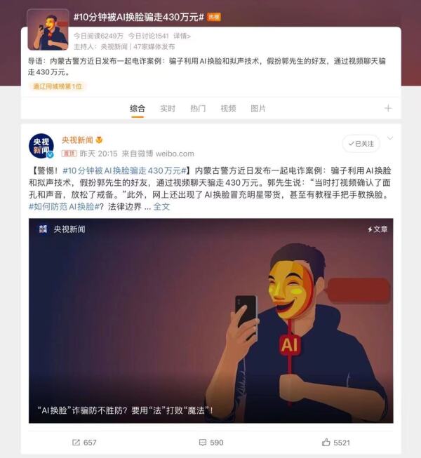 此前,央视曾报道一起金额高达430万元的AI换脸诈骗,过程与此案基本相似,诈骗分子都运用到了AI换脸以及拟声技术:4月20日,福建某科技公司法人代表郭先生突然接到“好友”微信视频,对方称自己的朋友在外地竞标,需要430万元保证金,郭先生见视频中的面孔和声音确实是“好友”,于是放松了警惕,仅在10分钟之内就向对方转账430万元。在福建、包头两地警方、银行的帮助下,其中300多万元被拦截,目前仍有90多万还在追查中。