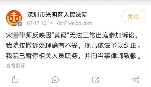 这一事件爆出之后,引发舆论关注。7月17日下午,深圳市光明区人民法院通过官方微博回应此事称,宋律师反映因“黄码”无法正常出庭参加诉讼,法院按撤诉处理确有不妥,现已依法予以纠正,已暂停相关人员职务,并向当事律师致歉。