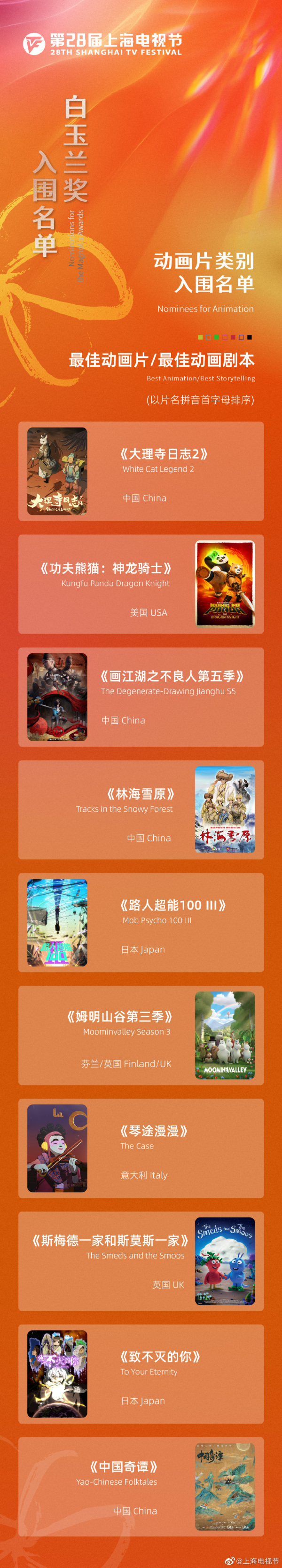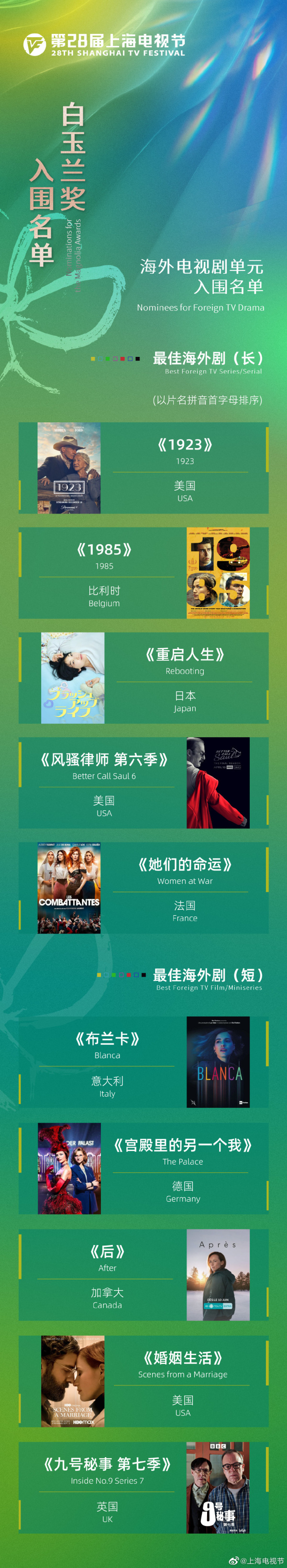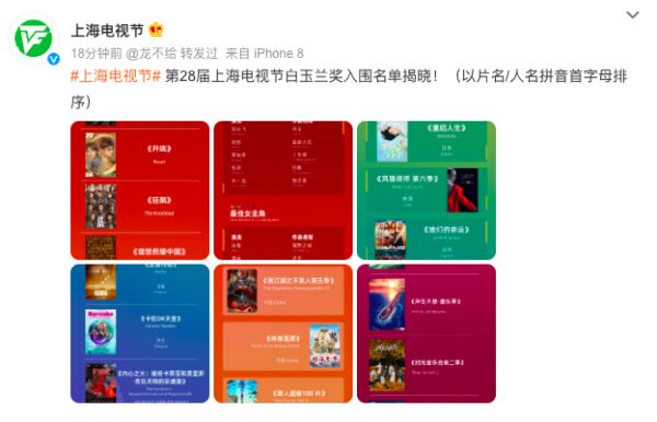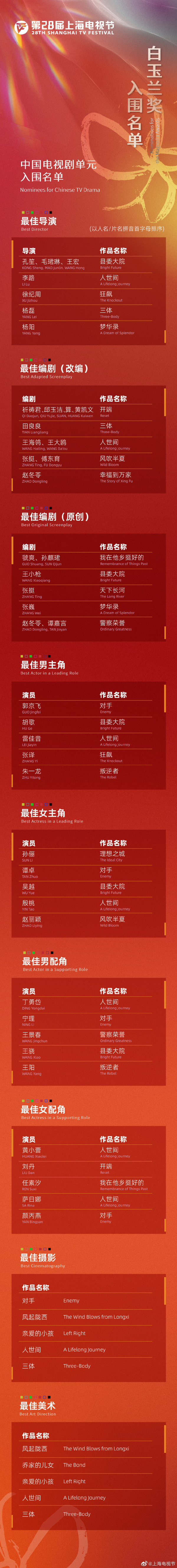 今(26)日,上海电视剧官方微博公布了第28届上海电视节白玉兰奖入围名单(以片名/人名拼音首字母排序)。