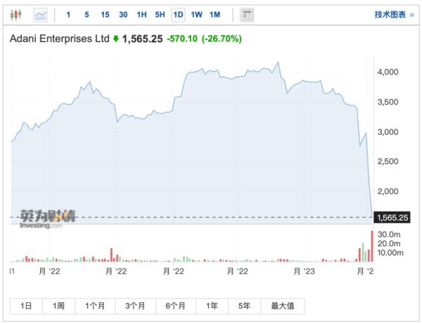 当地时间2月2日,阿达尼集团旗下的10家上市公司股价集体重挫,其中,旗舰企业Adani Enterprises更是一度狂泻30%,截至收盘,跌幅仍高达26.7%。而在前一日,Adani Enterprises股价已暴跌28%,近2个交易日累计跌幅超47%。