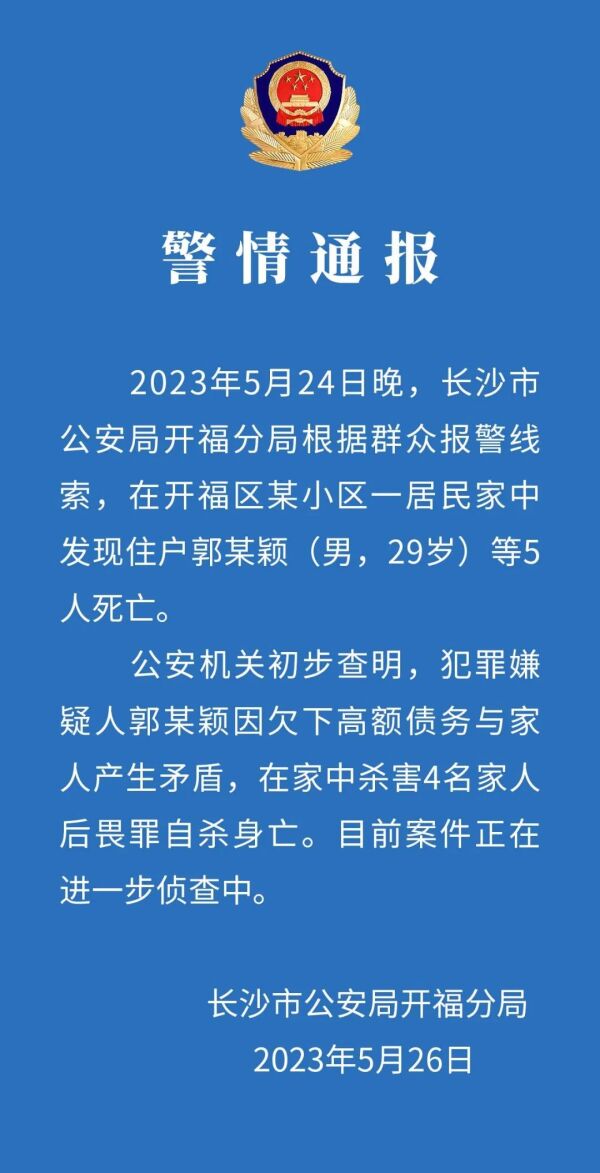 导读:日前,长沙开福区某小区一房间内发现5具尸体,5月26日,警方通报:嫌犯因债务与家人发生矛盾,杀害4名家人后畏罪自杀身亡。