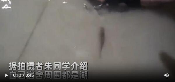 导读:25日,湖北武汉出现降水天气多地积水,一高校宿舍进水有鱼游进屋内。拍摄者朱同学称:宿舍周围都是湖,每年下大雨湖水上涨都会这样。