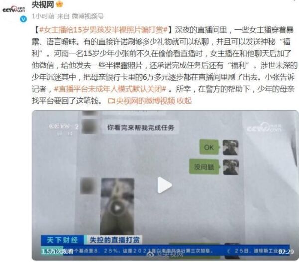 导读:近日,河南一名15岁少年小张在偷偷看直播时,女主播在和他聊天后加了他微信,给他发去一些半裸露照片,还承诺刷够礼物后还有“福利”。
