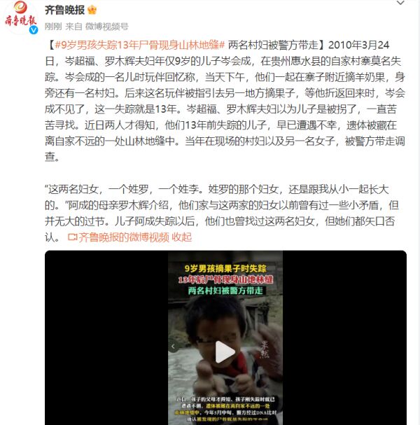 5月27日,据齐鲁晚报:2010年3月24日,岑超福、罗木辉夫妇年仅9岁的儿子岑会成,在贵州惠水县的自家村寨莫名失踪。岑会成的一名儿时玩伴回忆称,当天下午,他们一起在寨子附近摘羊奶果,身旁还有一名村妇。后来这名玩伴被指引去另一地方摘果子,等他折返回来时,岑会成不见了,这一失踪就是13年。岑超福、罗木辉夫妇以为儿子是被拐了,一直苦苦寻找。近日两人才得知,他们13年前失踪的儿子,早已遭遇不幸,遗体被藏在离自家不远的一处山林地缝中。当年在现场的村妇以及另一名女子,被警方带走调查。