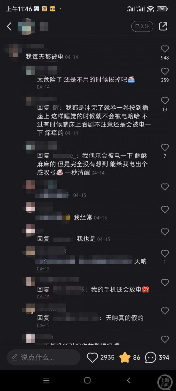 自称被苹果充电头电到的人不在少数,不少人都在评论区表示有类似经历,“我每天都被电”“我之前也被电过”“对滴,我也好几次被电”。