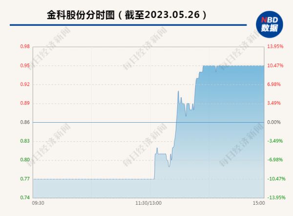 26日早盘,金科股份开盘再次跌停,股价只有0.77元,但午后金科股份快速拉升并触及涨停,日内上演“地天板”,成交金额超6亿元。截至收盘,金科股份以10.46%涨幅位居板块第一,报0.95元/股。