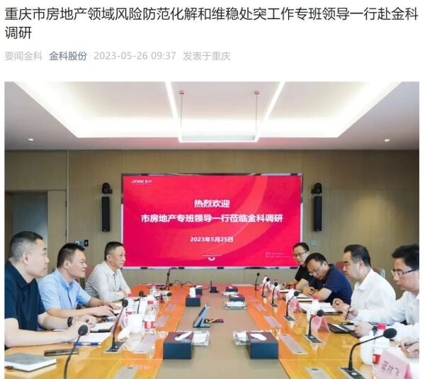 金科股份官微26日上午发布信息显示,5月25日下午,重庆市房地产领域风险防范化解和维稳处突工作专班副组长、市住房城乡建委一级巡视员张其悦,专班副组长、市住房城乡建委总经济师陈拥军一行深入金科中心调研。在这场调研上,重庆市专班领导对金科在“三保”工作上取得的成绩表示认可,希望金科切实履行企业主体责任,全力筹集项目建设资金,大力推动项目建设交付。同时表示,对金科提出的有关意见建议,将在合法合规的前提下,全力支持、促进金科正常经营。