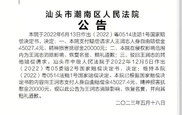 潮南法院于2023年5月18日的公告称,该院已经根据国家赔偿决定书的内容向王润志支付人身自由赔偿金45027.4元、精神损害抚慰金20000元,现以此公告为王润志消除影响、恢复名誉,并向其赔礼道歉。