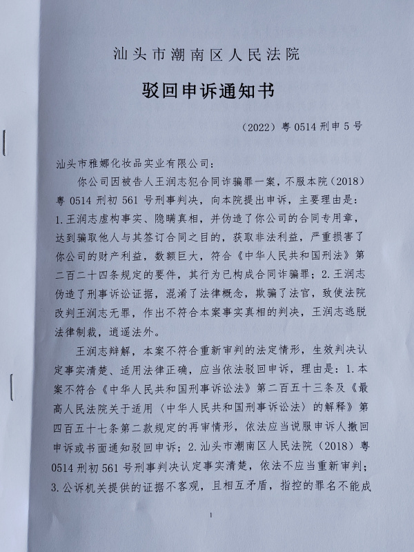 而报警抓捕王润志的雅娜公司,在王润志被判无罪时隔1年8个月后,向潮南法院递交了刑事申诉书,要求追究王润志的刑事责任。2023年4月4日,潮南法院作出驳回申诉通知书,对此予以驳回。