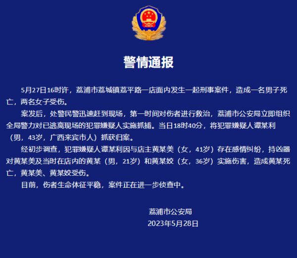 导读:5月27日,荔浦市荔城镇荔平路一店面内发生一起刑事案件,造成一名男子死亡,两名女子受伤。经初步调查,犯罪嫌疑人因与店主存在感情纠纷持凶伤人。