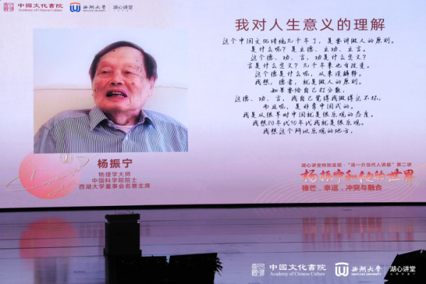 导读:5月27日,西湖大学湖心讲堂开展“汤一介当代学人讲座”第二讲。记者从西湖大学获悉,杨振宁在讲座上视频致辞:自己在立德立功立言方面做得不坏。
