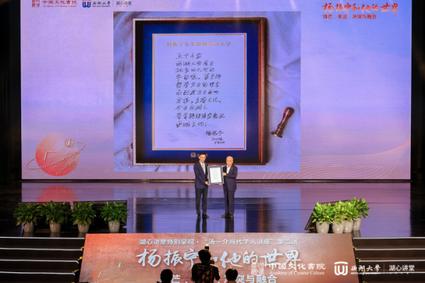 讲座最后,杨振宁先生专门为西湖大学亲笔题赠,西湖大学校董、西湖教育基金会理事长陈越光先生作为代表将这一珍贵礼物赠予西湖大学,西湖大学校长施一公接受赠礼。